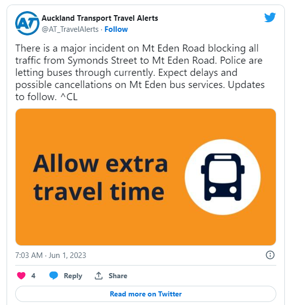 Auckland Transport said police were letting buses through, but delays and possible cancellations of Mt Eden bus services were expected.
