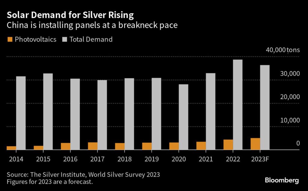 Solar is still a fairly small part of overall silver demand, but it’s growing. It’s forecast to make up 14% of consumption this year, up from around 5% in 2014, according to a report from The Silver Institute, an industry association. Much of the growth is coming from China, which is on track to install more panels this year than the entire total in the US.
