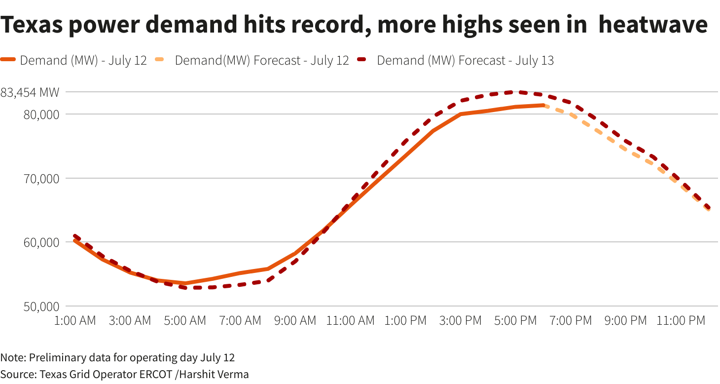 July 12 (Reuters) - Demand for power in Texas hit a record high on Wednesday as homes and business cranked up air conditioners during a lingering heatwave, according to data from the state's power grid operator.