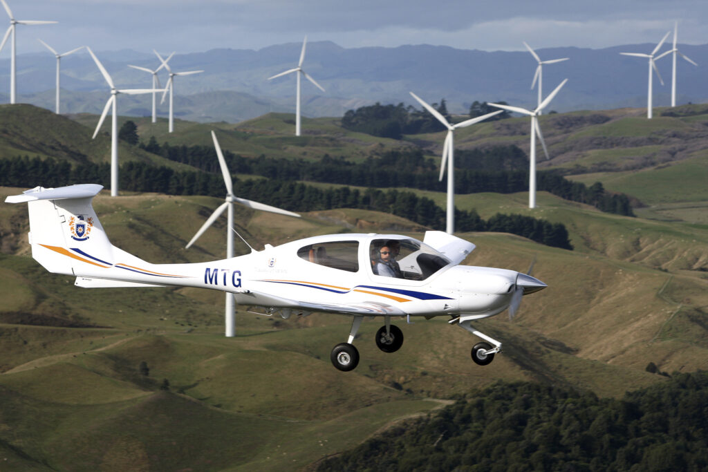 Flight instructors Russell Rickards and Paul Kearney fly their plane past the Te Apiti wind farm near Palmerston North, New Zealand, on July 2, 2009. New Zealand’s government said Tuesday, Aug. 8, 2023, it will partner with U.S. investment giant BlackRock in an aim to become one of the first nations in the world to have its electricity grid run entirely from renewable energy. (Mark Mitchell/New Zealand Herald via AP)
