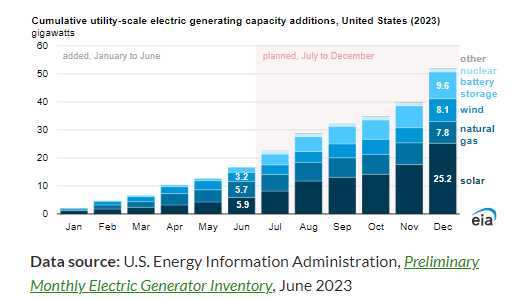 In the first half of 2023, developers added 16.8 gigawatts (GW) of new utility-scale electric generating capacity to the U.S. power grid, according to our latest inventory of electric generators. Developers plan to bring an additional 35.2 GW of capacity online in the second half of the year.