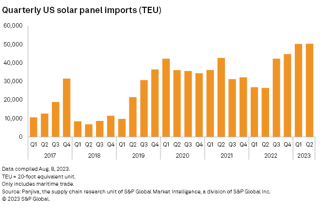 Second-quarter imports of photovoltaic panels surged 90.5% from a year ago to 50,409 twenty-foot equivalent unit shipping containers, according to Panjiva, the supply chain research unit of S&P Global Market Intelligence. The new quarterly high was slightly ahead of the first quarter of 2023 and marked the fourth consecutive quarter of rising imports after President Joe Biden in June 2022 waived tariffs on crystalline-silicon PV cells and panels from Southeast Asia alleged to be circumventing decade-old tariffs on China.
