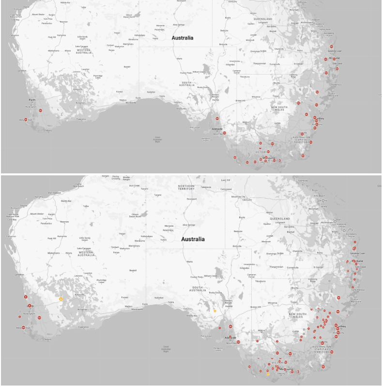 Here’s a comparison of the map of all Tesla Superchargers in Australia (bottom) and those opened to non-Tesla EVs: