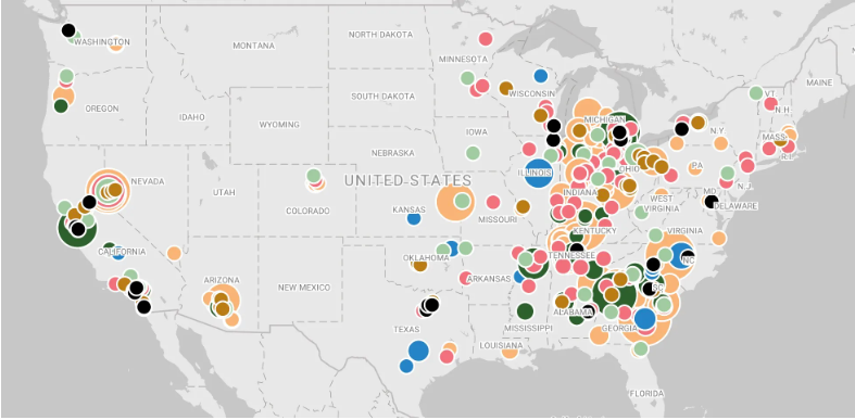 The interactive map can also sort locations by many other qualifications, like by company, source and amounts of government funding, plant unionization, party of the congressperson representing the district the plants are in, and so on.