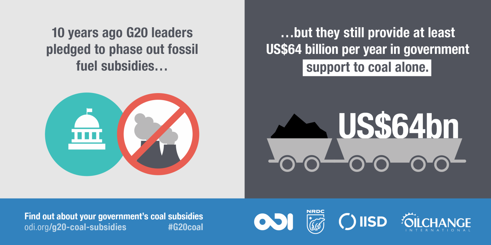 The new ODI report, G20 coal subsidies: Tracking government support to a fading industry, finds that G20 nations are supporting coal domestically and internationally to the tune of $63.9 billion each year, despite committing in 2009 to phase out fossil fuel subsidies.