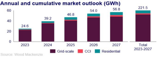 Wood Mackenzie projects the grid-scale segment to be the main driver of the market in its five-year forecast from 2023-2027, accounting for 83% of total installations, or 55 GW.