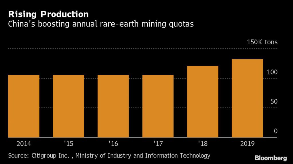 The quota for six dominant producers, including China Northern Rare Earth Group High-Tech Co., was set at 132,000 tons for 2019, the Ministry of Industry and Information Technology said in a statement on Friday. That compares with 120,000 tons in 2018 and is the highest in data going back to 2014.