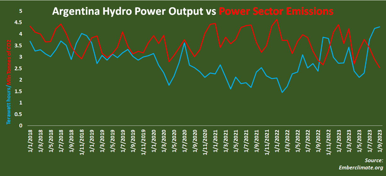 Argentina Hydro Power Output vs Power Sector Emissions