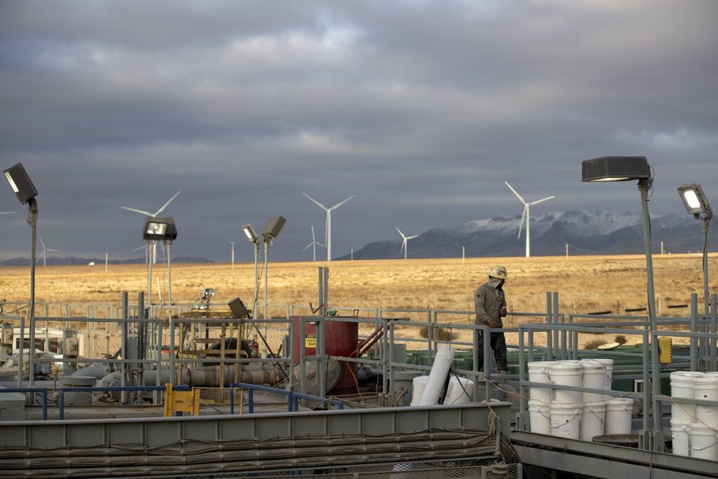 A rig operator walks through a Fervo Energy geothermal drilling site near Milford, Utah Sunday, Nov. 26, 2023, with a wind farm in the background. In Nevada, Fervo Energy’s first operational geothermal project has begun pumping carbon-free electricity onto that state’s electric grid to power Google data centers, Google announced Tuesday, Nov. 28. That pilot will help Fervo launch projects like this one in Utah to deliver far more carbon-free electricity to the grid. (AP Photo/Ellen Schmidt)