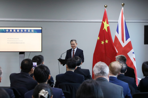 Before the forum, Ambassador Zheng and participants visited the exhibition showcasing the achievements of China-UK hydrogen energy cooperation.