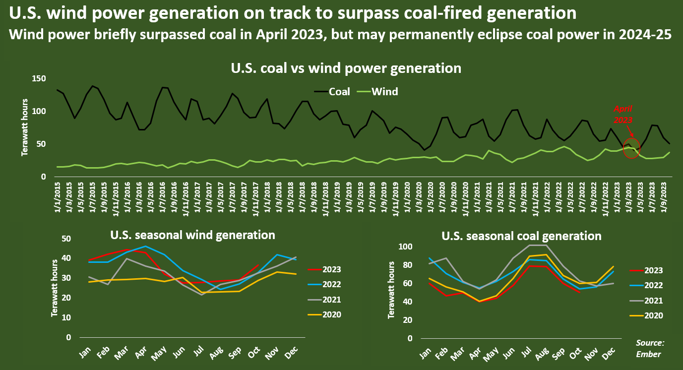 U.S. wind generation already briefly surpassed total coal-fired power output in April this year, when wind electricity generation totalled 42.85 terawatt hours compared to the 39.8 TWh generated by coal plants, according to Ember.