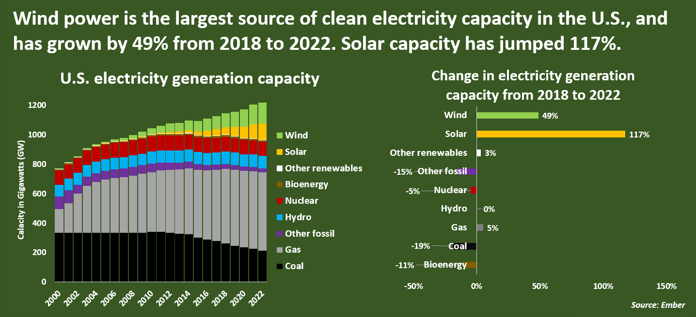 Wind power is the largest source of clean electricity capacity in the U.S., and has grown by 49% from 2018 to 2022.