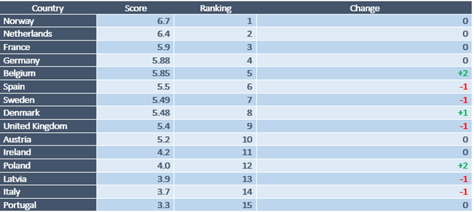 The Electric Vehicle Country Attractiveness (EVCA) Index is a quarterly ranking that charts the relative attractiveness of major European nations for investment in EVs. A range of indicators, subject to differing weightings, have been utilised in the production of this index. They are listed as follows without regard to importance or weighted value: