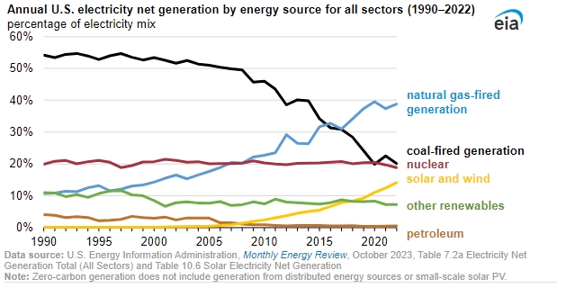 Natural gas-fired and new zero-carbon power sources acted as substitutes for coal-fired generation amid shortages and unfavorable economic conditions. Between January 2021 and December 2022, U.S. coal-fired generation capacity declined by more than 25,000 megawatts, while natural gas-fired capacity increased by over 17,000 megawatts. Zero-carbon generation also grew in 2022, and its share of the total generation mix increased from 39% in 2021 to 40% in 2022. However, overall electric power sector emissions in 2022 remained near 2021 levels because increases in emissions from natural gas offset decreases in emissions from coal and because total electricity demand increased by 3%.