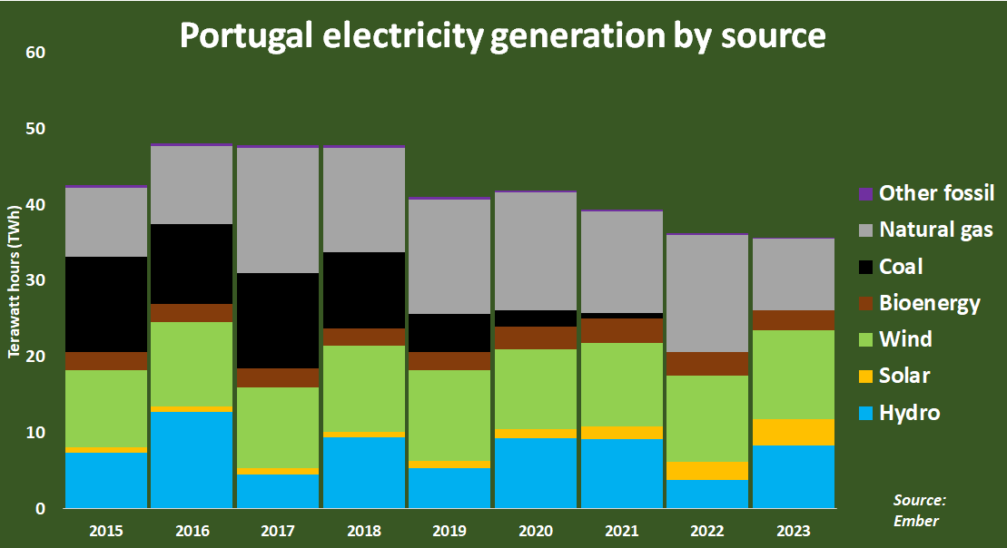 Of the roughly 36 terawatt hours (TWh) of electricity generated by Portugal's power system through November, 8.34 TWh (23.4%) came from hydropower sources, according to Ember.