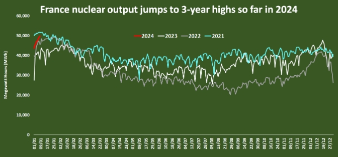 Nuclear power production in France jumped to its highest levels in three years over the first nine days of January, marking an 18% jump in nuclear generation from the same period in 2023, according to power generation data compiled by LSEG.