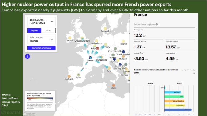 Through Jan. 9, France has been an average daily net exporter of over 12.2 gigawatts (GW) of power, with close to 3 GW heading to Germany and a further 6 GW distributed to Switzerland, the United Kingdom and Italy, according to International Energy Agency (IEA).