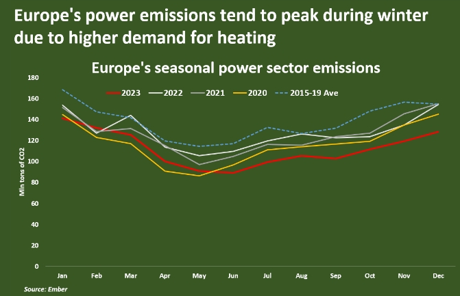 What's more, Europe's power emissions tend to peak during the winter when higher heating demand spurs the region's power producers to increase output from all sources - including coal - in order to meet elevated energy consumption levels.