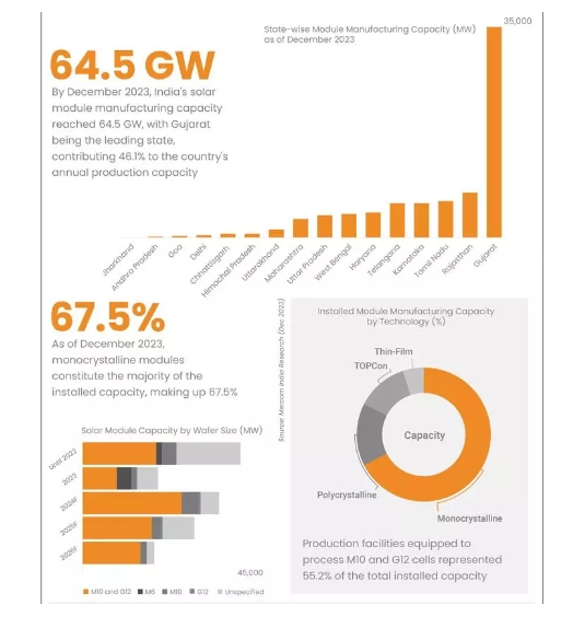 During the calendar year, the country added 20.8 GW of solar modules and 3.2 GW of solar cell capacity, taking the cumulative solar module manufacturing capacity to 64.5 GW and solar cell manufacturing capacity of 5.8 GW as of December 2023, according to a report by Mercom India.