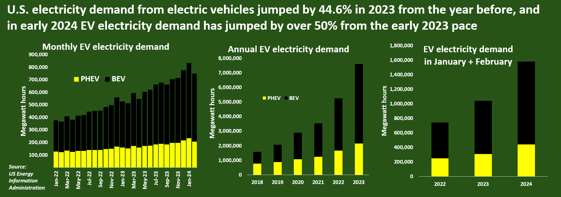 U.S. electricity demand from electric vehicles jumped by 44.6% in 2023 from the year before, and in early 2024 EV electricity demand has jumped by over 50% from the early 2023 pace