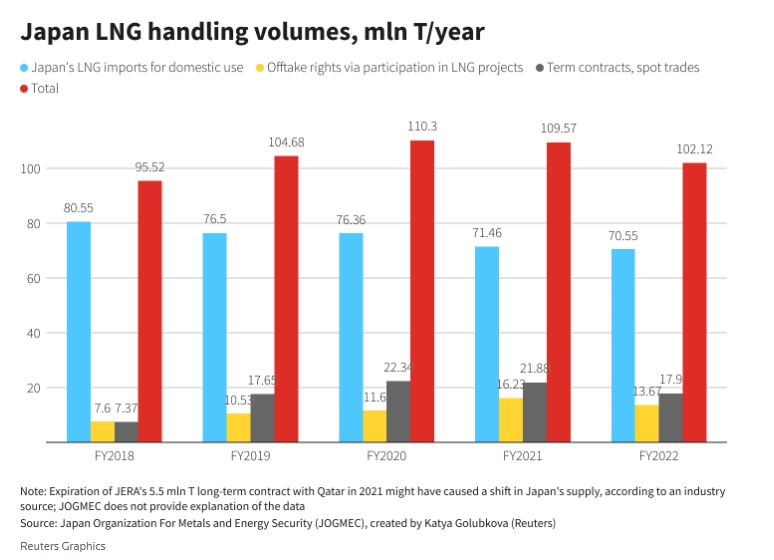 Of Japan's 102 million tons of LNG imports in fiscal 2022, domestic use accounted for 71 million tons.