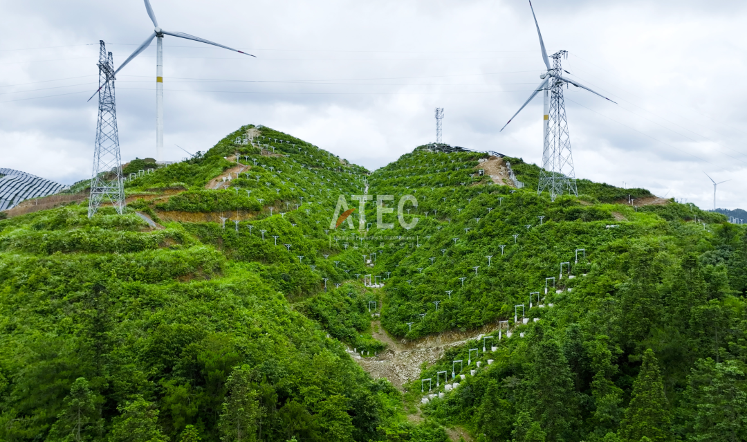 The new generation of ATEC SunOptimus Flexible Brackets,Pre-stressed steel strands are used to fix the PV modules,The strand span can reach over 17 metres,Adapts to the slope,Maximum adapt to steep slopes, gullies and other complex mountainous terrain ,Reduced row spacing at the same time,Average 16mu/MW(1mu=666.7m2),Improve the land use rate by more than 30%,Maximise land use efficiency Satisfy the demand for installation capacity,Let the light of science and technology bloom in the mountains.