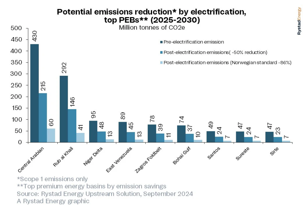 “The top 10 PEBs (by emissions savings) alone account for over 80% of these savings (Figure 3), with the Middle Eastern Rub al Khali (370 million tonnes of carbon dioxide equivalent [CO2e]) and Central Arabian (251 million tonnes of CO2e) leading the charts. Electrification in these predominantly onshore basins, if adopted more widely, would largely be driven by drawing power from a clean onshore grid.”