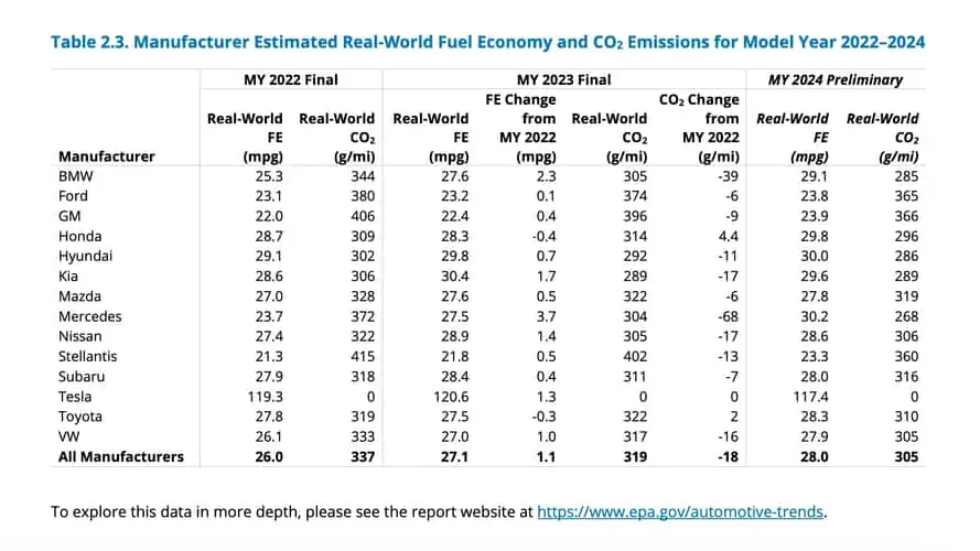 So, who are the good and the bad actors? Tesla has been the manufacturer with the highest fuel economy since 2016 when it began mass production of the Model 3 sedan. That’s unsurprising because Tesla only makes fully electric models. However, according to EPA data, Stellantis has manufactured the dirtiest cars since 2015. Both automakers will remain in the same spots in 2024, as per a preliminary estimate.