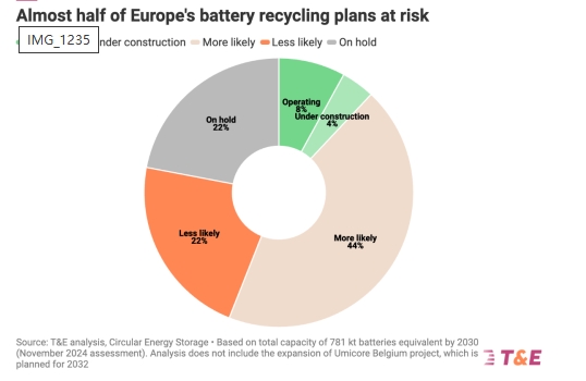 As well as reducing both extraction and imports of raw materials, recycling in Europe could cut the carbon footprint of sourcing lithium by almost a fifth (19%) compared to extracting it in Australia and refining it in China. This is due to Europe’s cleaner electricity grid. But to reap the economic and sustainability benefits, Europe needs to scale up its recycling industry. Almost half of the recycling capacity that has been announced for the region is on hold or uncertain to go ahead, according to the report.
