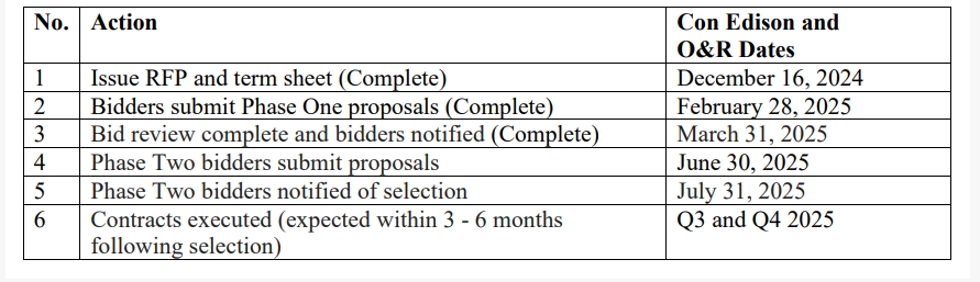 The first part of the application will request information from bidders to allow Con Edison and O&R to conduct a general evaluation of the bidder’s qualification and the potential viability of the bid. It is expected that during phase one the utilities’ market evaluations will enable them to provide bidders initial guidance regarding the viability of their bids. Following approval from the respective utility, selected bidders will be asked to complete phase two of their application, and the information provided therein will become binding.