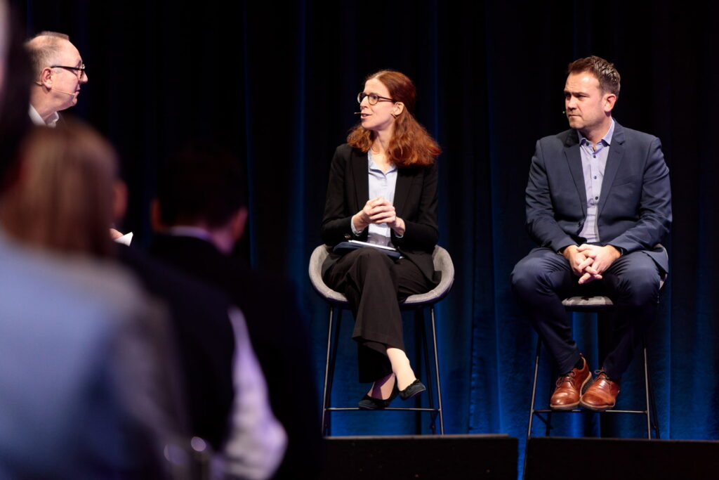 Axelle Viré, Delft University of Technology (TU Delft) and Tommy Sandtorv at OEEC 2024 Floating Wind conference session; Photo: Navingo