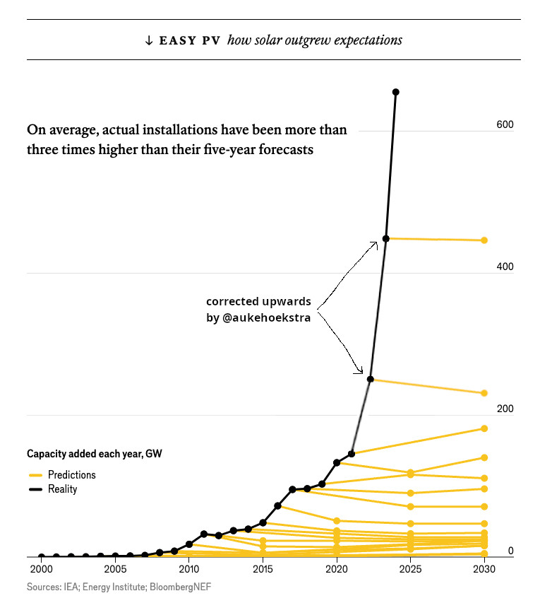 Our ability to predict technological advancements and deployment scales is notably imperfect, as demonstrated by the historical underestimates of solar capacity expansions. The chart above, initially created by Auke Hoekstra, (founder and director of the NEON research program), highlights the International Energy Association’s consistent underestimation of the solar revolution since the early 2000s. This serves as a stark reminder of our forecasting limitations; as recently as 2022, the deployment of over 400 GW of solar capacity far exceeded analysts’ predictions, and we are now anticipating our first terawatt year, with expectations of reaching 600 GW of global solar capacity by 2024.