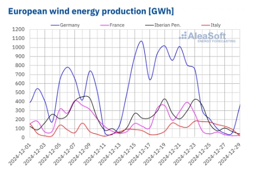 In the week of December 30, according to AleaSoft Energy Forecasting’s wind power production forecasts, the downward trend will reverse in Germany and France, while in Italy, Portugal and Spain wind power production will decrease.