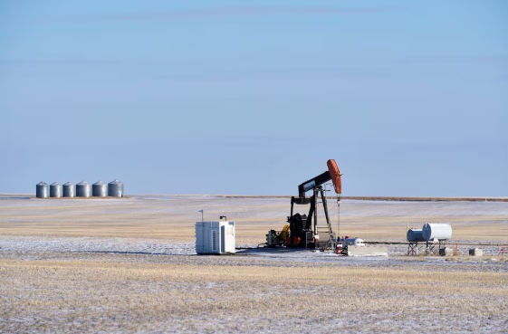 A view of an oil pump jack on the prairies near Claresholm, Alberta, Canada January 18, 2025.
