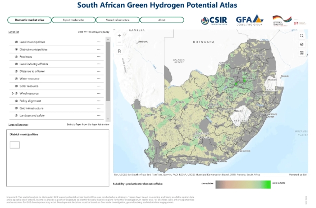The second tool is the South African Green Hydrogen Potential Atlas, an interactive geospatial tool that maps the country's most suitable regions for green hydrogen development. This atlas is based on a multi-criteria analysis that considers spatially explicit key siting variables representing environmental conditions and sensitivities, different uses and users of the environment, and the requirements for green hydrogen production. It showcases the potential for green hydrogen production aimed at export and domestic markets and highlights areas where enabling shared infrastructure could be leveraged to create a South African green hydrogen economy.