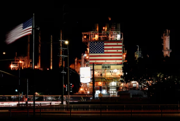 U.S. flags are displayed at Marathon Petroleum's Los Angeles Refinery in Carson, California, U.S., March 11, 2022.