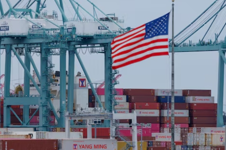 FILE PHOTO: A U.S. flag flutters near shipping containers as a ship is unloaded at the Port of Los Angeles, in San Pedro, California, U.S., May 1, 2025.