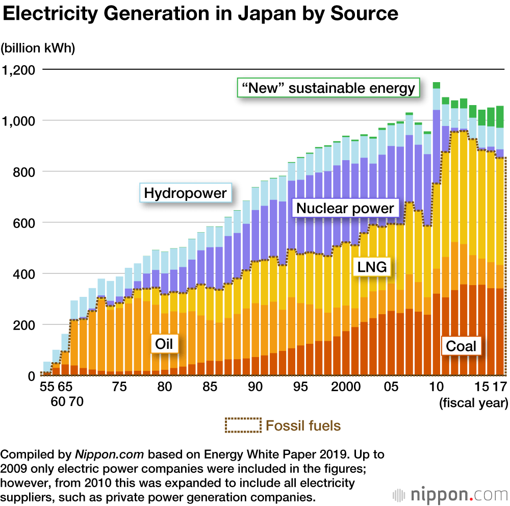 In 2017, Japan’s power generation breakdown was 39.8% liquefied natural gas, 32.3% coal, 8.7% oil, 8.1% “new” forms of sustainable energy, 8.0% hydro, and 3.1% nuclear. The amount of coal-fired power remained around the same level as that for 2016.