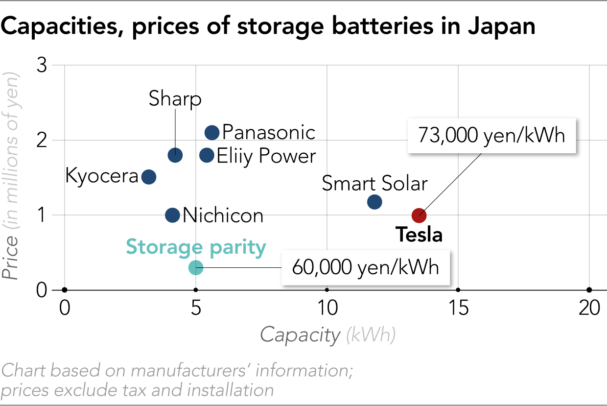 Prices for home power-storage batteries look likely to fall in Japan as U.S. electric car maker Tesla moves to offer its Powerwall batteries here, with major implications for the country's utilities.