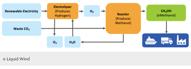 The facility will capture waste carbon dioxide and combine this with hydrogen, made from renewable electricity and water, to produce renewable methanol, e-methanol.