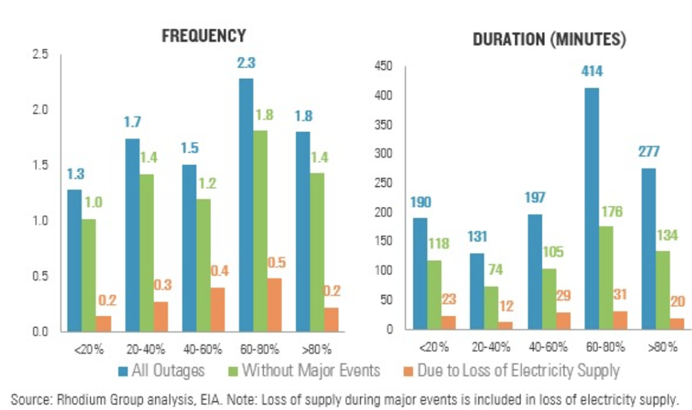 A study from the Rhodium Group examined the link between reliability and fuel secure generation–specifically coal and nuclear power–and found that there is no relationship between greater levels of these resources and grid reliability. The study combines shares of coal and nuclear generation in each balancing authority (BA)–entities that are responsible for managing electricity supply and demand in a designated area. It groups them into five bins from <20 percent coal and nuclear–up to >80 percent of coal and nuclear–and examines the frequency and duration of outages in each BA.