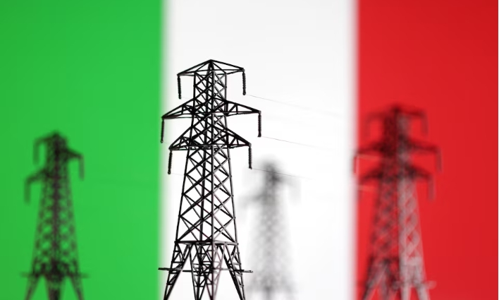 Electric power transmission miniatures are seen in front of displayed Italian flag in this illustration taken, December 5, 2022. REUTERS/Dado Ruvic/Illustration…