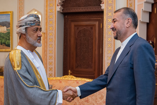 This handout photo provided by the Oman News Agency shows Oman's Sultan Haitham Bin Tariq Al Said shaking hands with Iran's Foreign Minister Hossein Ami…