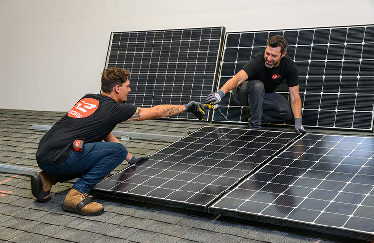 Solar installers from Baker Electric place solar panels on the roof of a residential home in Scripps Ranch, San Diego, California, U.S. October 14, 2016. Pictur…