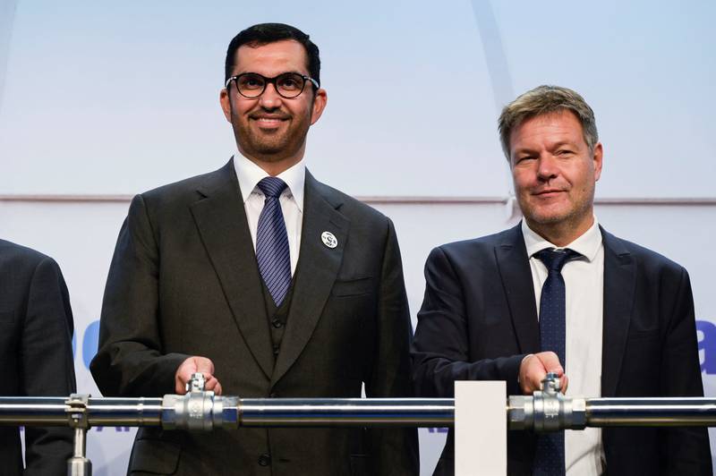 Dr Sultan Al Jaber, Minister of Industry and Advanced Technology, and German Vice Chancellor Robert Habeck attend ceremony in Hamburg