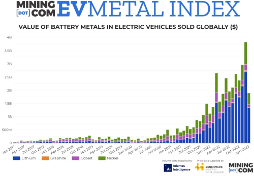 Mining.com EV Metal Index Shows Value of Battery Metals in Newly Registered Electrified Vehicles up 232% Y-O-Y in 2022
