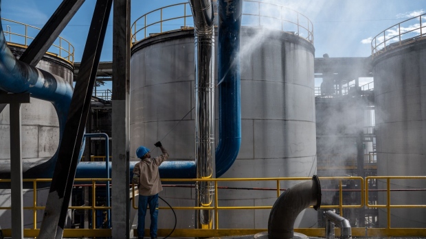 A worker cleans a pipe at the Riopaila Castilla ethanol distillery in Zarzal, Valle del Cauca department, Colombia, on Tuesday, July 11, 2023. The Colombian Bio…