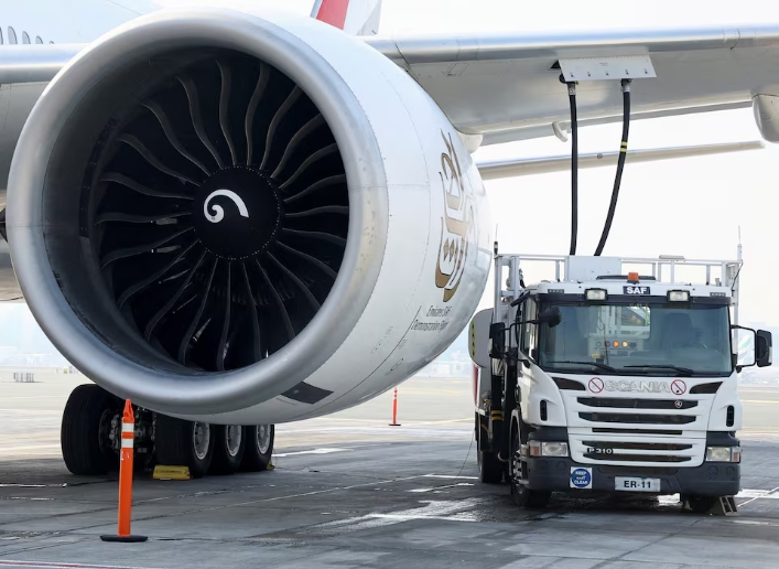A fuel truck fills up the Emirates Airlines Boeing 777-300ER with Sustainable Aviation Fuel (SAF), during a milestone demonstration flight while running one of …