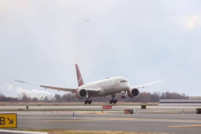 Virgin Atlantic Boeing 787 arrives to complete the first 100% Sustainable Aviation Fuel transatlantic flight from London's Heathrow airport to John F. Kenne…