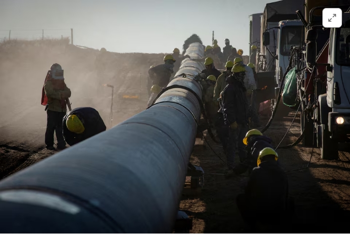 People work during the construction of the Nestor Kirchner gas pipeline in Macachin, La Pampa, Argentina April 26, 2023. REUTERS/Martin Cossarini/File Photo Pur…